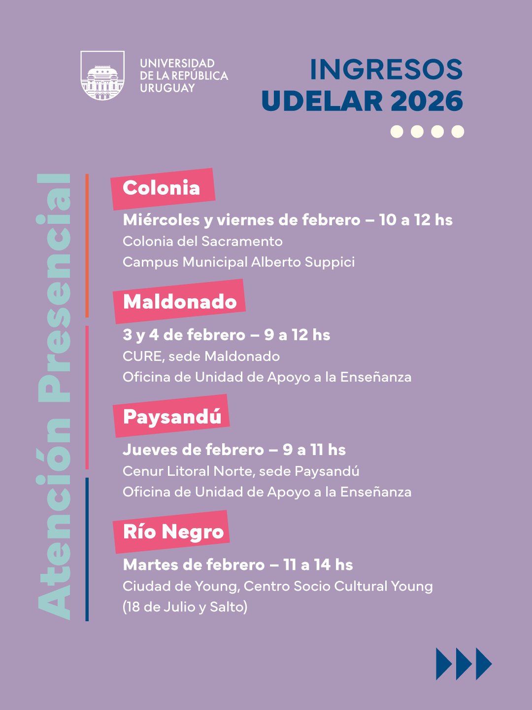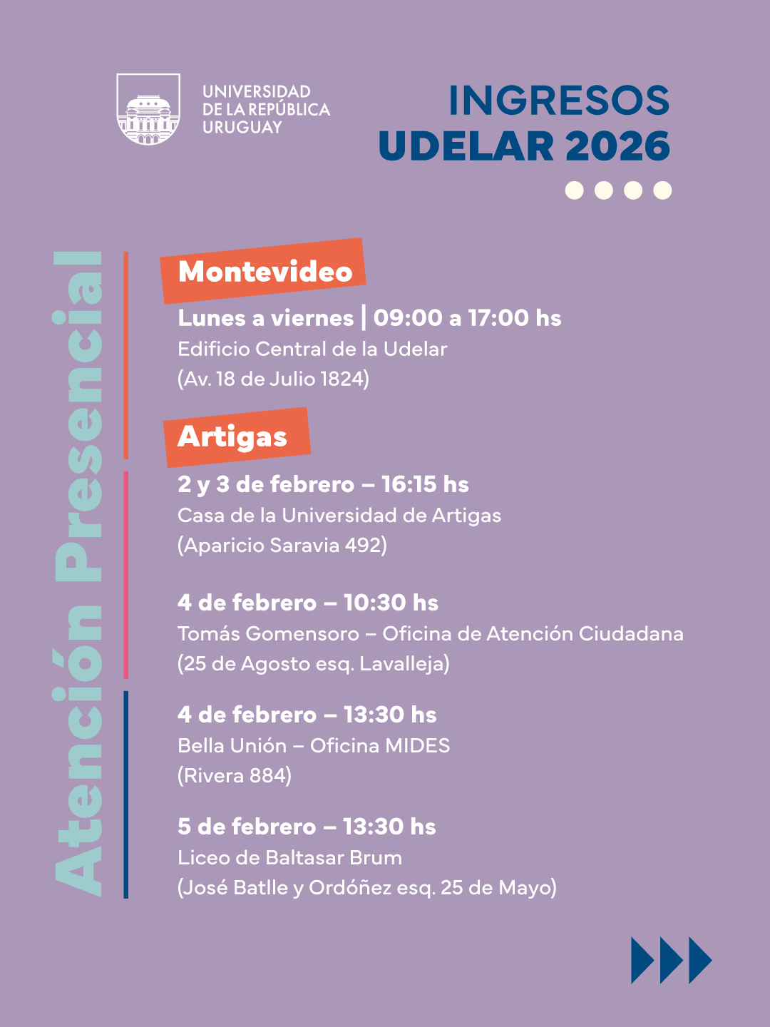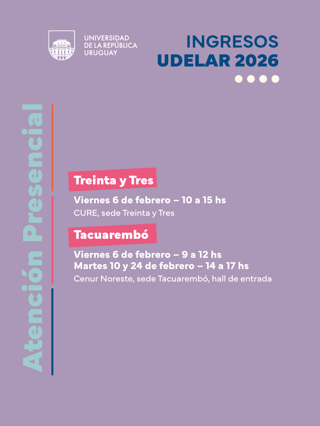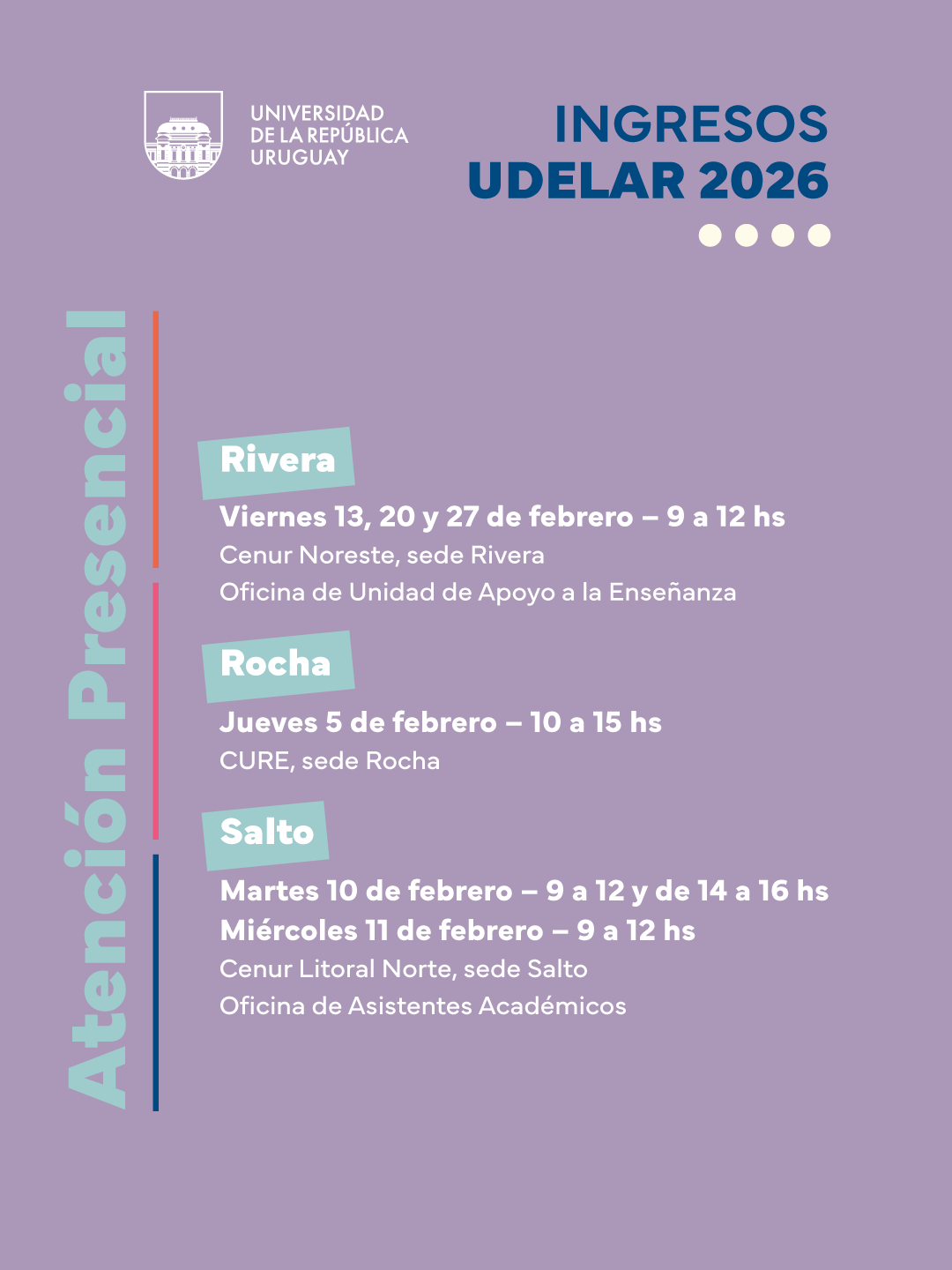 La Universidad de la República cuenta con atención presencial en las distintas sedes y un espacio de atención virtual personalizado para que recibas apoyo en tu inscripción. También cuenta con un formulario de consulta al que podrás acceder aquí